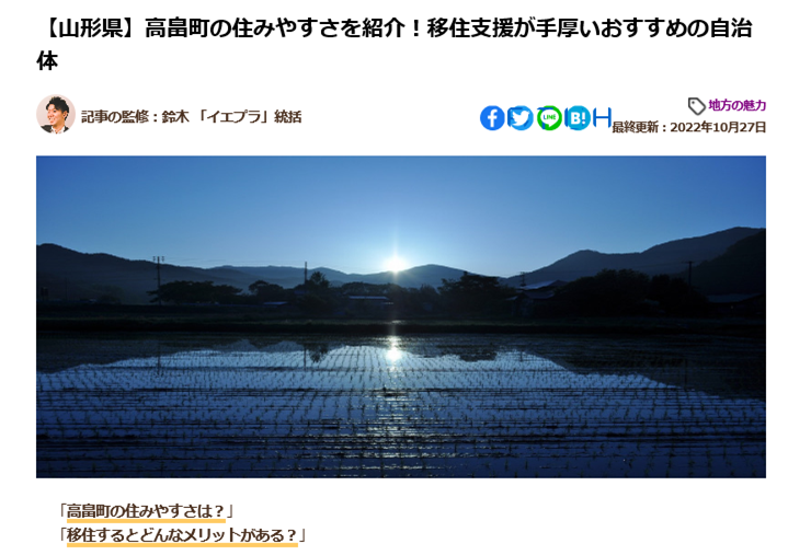 「イエプラ」が運営する住まい情報メディア「Rooch(ルーチ)」で、移住に最適な町のひとつとして高畠町が紹介されました。