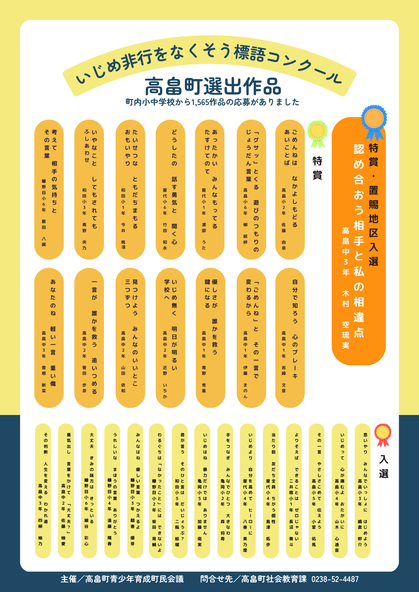 本年度の「いじめ防止」標語コンクールに町内小・中学校の児童、生徒の皆さんから1,565点の作品が寄せられ、高畠町審査会による審査の結果、添付の一覧表のとおり30名の皆さんが入選となりました。